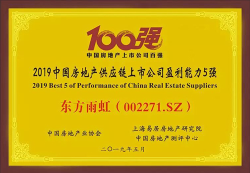 5月23日,由中國房地產業協會、上海易居房地產研究院中國房地產測評中心聯合開展的“2019中國房地產上市公司測評成果發布會”在香港召開。東方雨虹憑借強大的綜合實力,榮獲“2019中國房地產供應鏈上市公司盈利能力五強”。