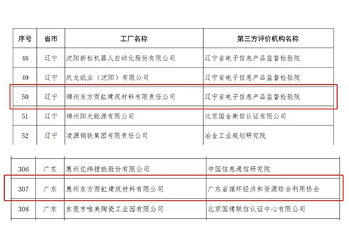 近日,工信部公布第三批綠色制造名單,錦州、惠州東方雨虹雙雙上榜,東方雨虹的綠色化之路再添佳績。