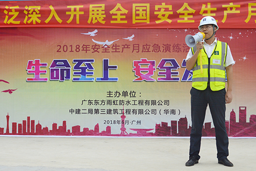 6月15日,廣東東方雨虹聯(lián)合中建二局第三建筑工程有限公司(華南)共同主辦的2018年安全生產(chǎn)月應(yīng)急演練活動(dòng)在廣州信達(dá)金茂廣場(chǎng)項(xiàng)目成功舉辦。廣東東方雨虹質(zhì)安、項(xiàng)目管理人員及項(xiàng)目現(xiàn)場(chǎng)各單位項(xiàng)目經(jīng)理、施工員約100余人參與本次活動(dòng)。