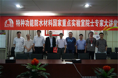 6月12日下午,應特種功能防水材料國家重點實驗室邀請,法蘭西大學研究院院士,法國特等教授Christophe Thomas博士參觀訪問東方雨虹國家重點實驗室,并作題為《雜環單體聚合:一種簡單的生物基聚合物可控聚合方法》的學術報告。報告會由東方雨虹集團產品研發中心主任助理郭嘉博士主持,特種功能防水材料國家重點實驗室主任段文鋒以及東方雨虹研發系統百余名技術人員聆聽了本次報告。
