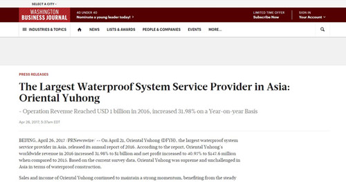 東方雨虹的市場(chǎng)表現(xiàn)都有著中國(guó)建筑防水領(lǐng)域風(fēng)向標(biāo)的作用。4月21日,東方雨虹發(fā)布2016年年報(bào),據(jù)報(bào)告顯示,2016年東方雨虹實(shí)現(xiàn)營(yíng)業(yè)總收入70億元,同比增長(zhǎng)31.98%;凈利潤(rùn)10.29億元,同比增長(zhǎng)40.97%。如此靚麗的成績(jī)單一經(jīng)發(fā)布,受到了包括Yahoo!、Washington Business Journal、TheStreet、MarketWatch等200余家國(guó)際媒體的關(guān)注。