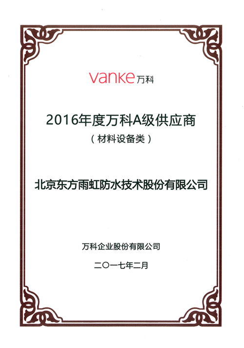 2月17日,萬科集團2017年合作伙伴春茗會在深圳大梅沙萬科總部召開,東方雨虹防水集團總裁劉斌、大客戶事業部總經理陳欣剛參加了此次會議。會上,萬科對外發布了“2016年合格供應商名錄”,在965家五大類合格供應商中,東方雨虹等117家合作企業被評為“A級供應商”。據悉,從2013年萬科開始發布該名錄起,這已是東方雨虹連續第四年榮獲此稱號。