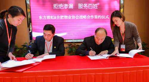 12月28日,北京東方雨虹防水技術股份有限公司與合肥物業協會在合肥豐大國際大酒店舉行了戰略合作簽字儀式,協議從2017年1月1日起生效,為期三年。東方雨虹工程渠道南方修繕事業部副總經理竇吉培、東方雨虹合伙人王建安,合肥物業協會會長候建平、秘書長程純潔、副會長及會員企業負責人等共四十余人出席了簽約儀式。