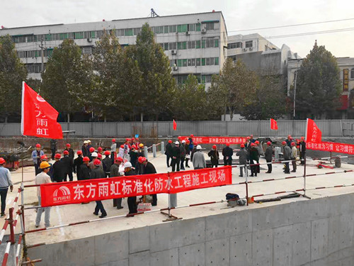 10月16日,焦作市人民防空辦公室組織各區(qū)縣人防辦相關(guān)領(lǐng)導(dǎo)、在建和待建人防工程項(xiàng)目負(fù)責(zé)人、具有人防功能的樓盤相關(guān)責(zé)任方代表共計(jì)170余人,觀摩東方雨虹武陟縣人防項(xiàng)目標(biāo)準(zhǔn)化施工工地。 觀摩團(tuán)對(duì)東方雨虹復(fù)合式防水構(gòu)造方案和機(jī)械化施工工藝進(jìn)行現(xiàn)場(chǎng)考察,并就現(xiàn)場(chǎng)防水施工及材料與東方雨虹進(jìn)行了深入交流,對(duì)東方雨虹的標(biāo)準(zhǔn)化施工給予了高度評(píng)價(jià)。