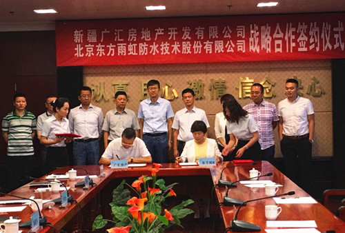 8月3日,新疆廣匯房地產(chǎn)開發(fā)有限公司與東方雨虹在廣匯集團(tuán)總部簽訂戰(zhàn)略合作協(xié)議。廣匯實(shí)業(yè)集團(tuán)董事、房產(chǎn)置業(yè)總經(jīng)理?xiàng)铊F軍,實(shí)業(yè)集團(tuán)董事局秘書李文強(qiáng),房產(chǎn)置業(yè)集團(tuán)總工程師王斌,開發(fā)公司副總經(jīng)理熊煒,招采中心主任賈建軍,人力資源行政部部長申強(qiáng);東方雨虹防水集團(tuán)副總裁張志萍,工程渠道事業(yè)部西北區(qū)總經(jīng)理?xiàng)詈C鳎こ糖朗聵I(yè)部新疆區(qū)域總經(jīng)理路曉征,工程渠道事業(yè)部新疆區(qū)域經(jīng)理李曉璐等出席簽約儀式。