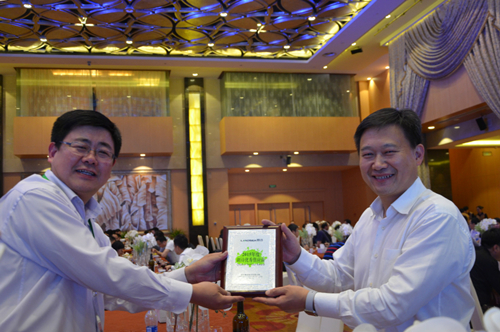 朗詩綠色地產董事長田明(右)向江蘇臥牛山公司副總秦峰濤頒發獎牌