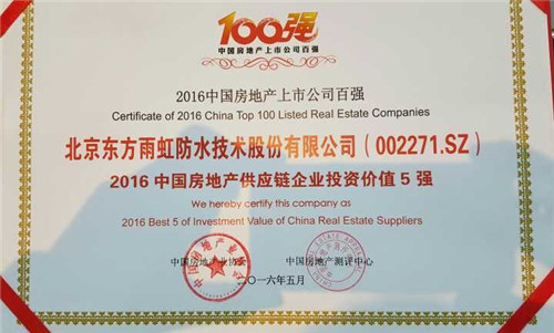 5月26日,由中國(guó)房地產(chǎn)業(yè)協(xié)會(huì)、中國(guó)房地產(chǎn)測(cè)評(píng)中心聯(lián)合開展的“2016中國(guó)房地產(chǎn)上市公司測(cè)評(píng)成果發(fā)布會(huì)暨上市房企高峰論壇”在香港盛大舉行,《2016中國(guó)房地產(chǎn)上市公司測(cè)評(píng)研究報(bào)告》等測(cè)評(píng)研究成果火熱出爐。東方雨虹獲評(píng)“2016中國(guó)房地產(chǎn)供應(yīng)鏈上市公司投資價(jià)值5強(qiáng)”。