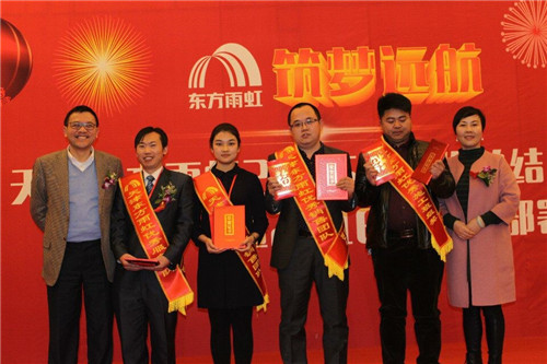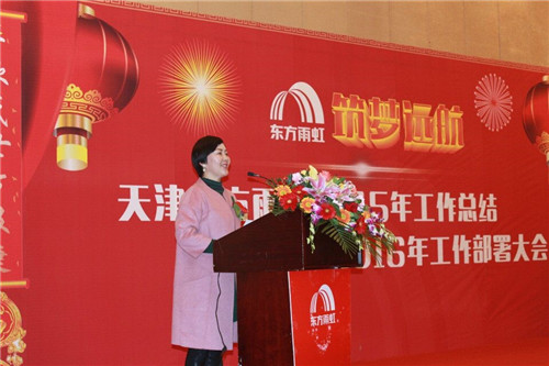 1月20日下午14:00,天津東方雨虹2015年度工作總結表彰暨2016年度工作部署大會在天津賽象酒店隆重召開。天津東方雨虹全員齊聚一堂,總結2015年經驗與得失,部署2016年工作計劃。東方雨虹董事長李衛國先生、東方雨虹品牌戰略中心總監陳志杰先生、天津市建材業協會防水專家委員會秘書長張秀香女士參會。 會議開始,天津東方雨虹董事長兼總經理文敬芳女士作《2015年工作總結暨2016年工作計劃》的報告,回顧了天津東方雨虹2015年的工作成果,詳細部署了2016年工作計劃及實施舉措。她強調,在2016年工作中,全體員工要進一步領悟和保持歸零心態,全面落實全心全意為客戶服務的精神。隨后,天津東方雨虹融創事業部總經理馬紅女士、總工程師彭波先生、總經理助理張錦玫女士及各部門負責人分別就部門工作做了總結匯報。
