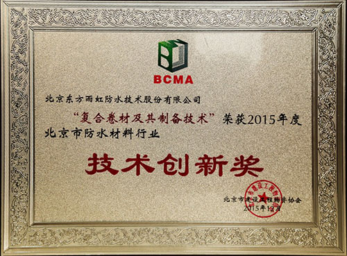 會(huì)上東方雨虹復(fù)合卷材及其制備技術(shù)及標(biāo)準(zhǔn)化施工服務(wù)體系分別榮獲2015年度北京市防水行業(yè)技術(shù)創(chuàng)新獎(jiǎng)、管理創(chuàng)新獎(jiǎng)。