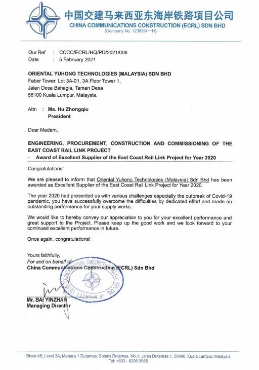 日前,東方雨虹(ORIENTAL YUHONG)喜獲2020年中國交建馬來西亞東海岸鐵路項目總經理部年度優秀供應商稱號。