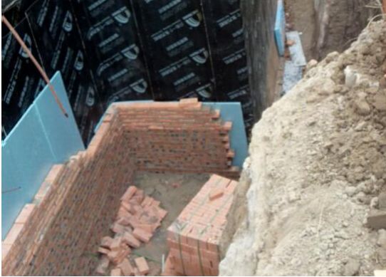 2. 在墻面涂刷基層處理劑,重新鋪貼卷材防水層,邊恢復保溫邊砌筑擋土磚墻邊回填土方。